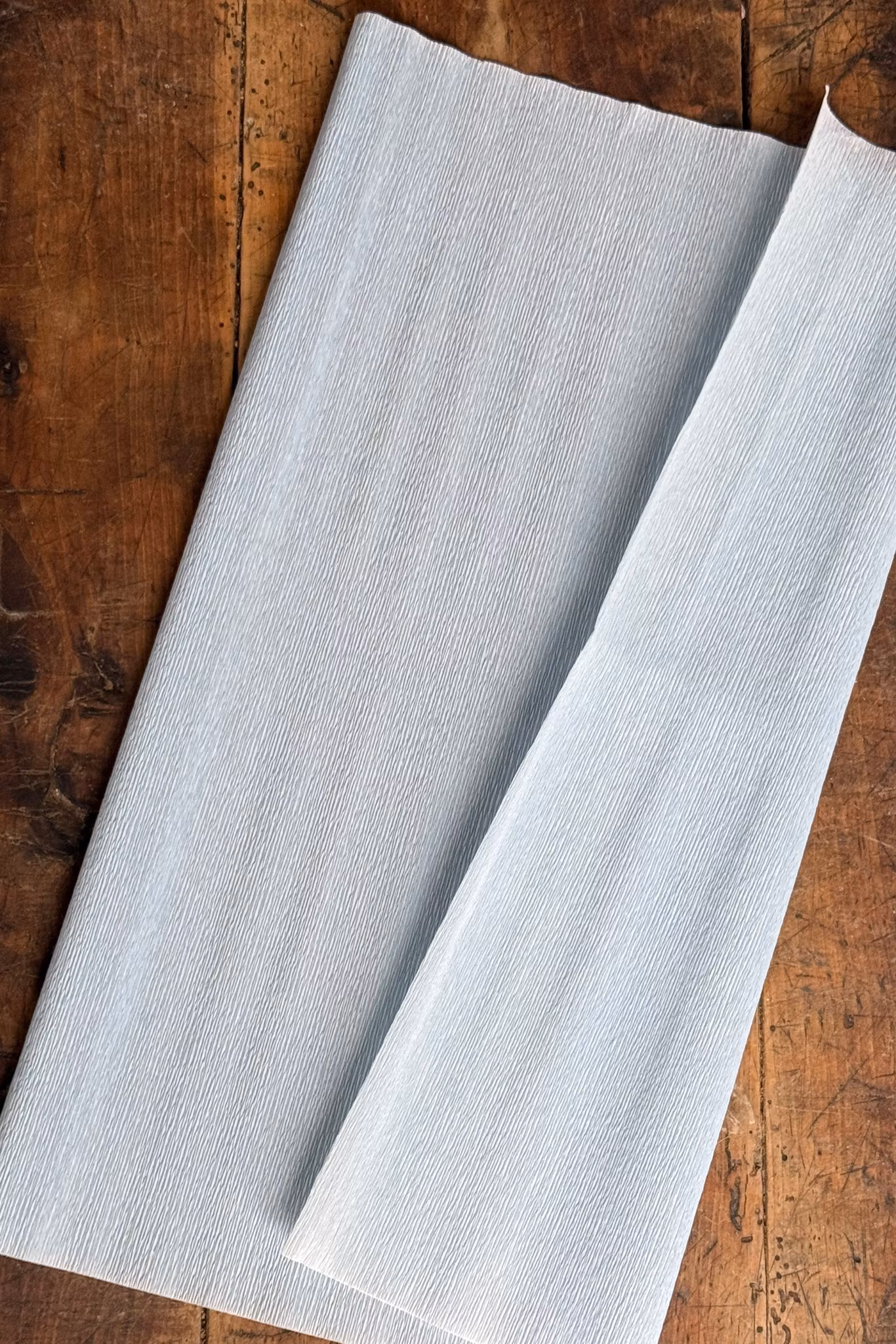 Du kan köpa pappret i rullar som är 50 x 250 cm eller i 50 x 50 cm bitar. Ljus turkos har fortfarande de tvärgående linjerna men de kommer tas bort.