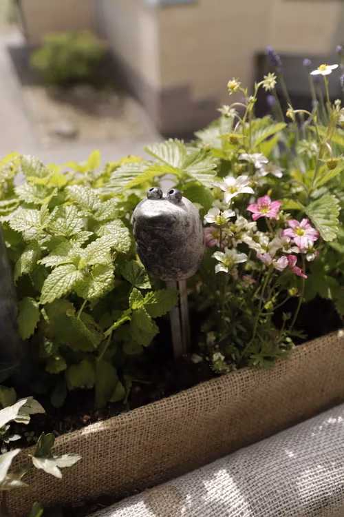 Han hälsar att han även kan sitta fint på en pinne bland dina blommor. Dock vill han komma in på vintern annars fryser han sönder.