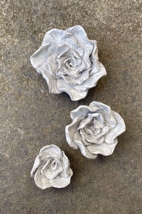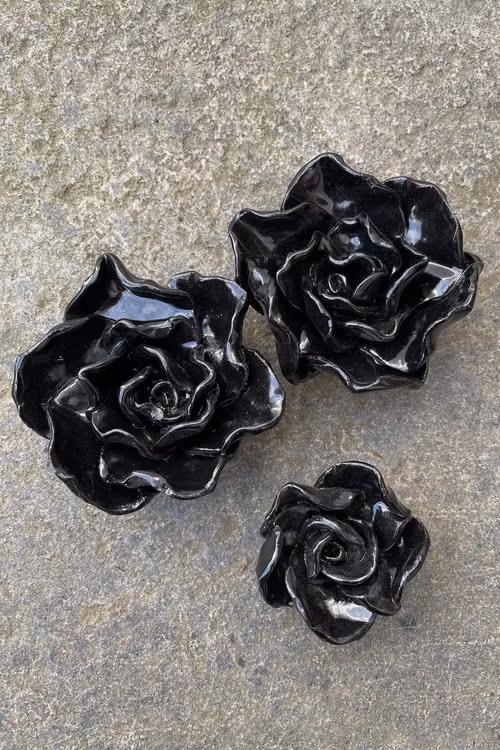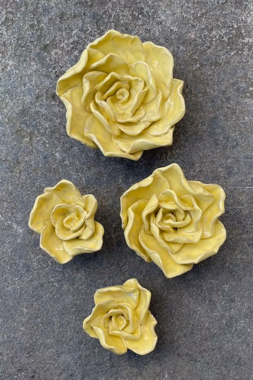 Jag gör rosorna i 3 olika storlekar och i flera olika härliga färger. Ibland använder jag restlera som kan ge lite variationer i glasyren. Alla rosor är handgjorda och kan skilja åt i utseende och storlek .